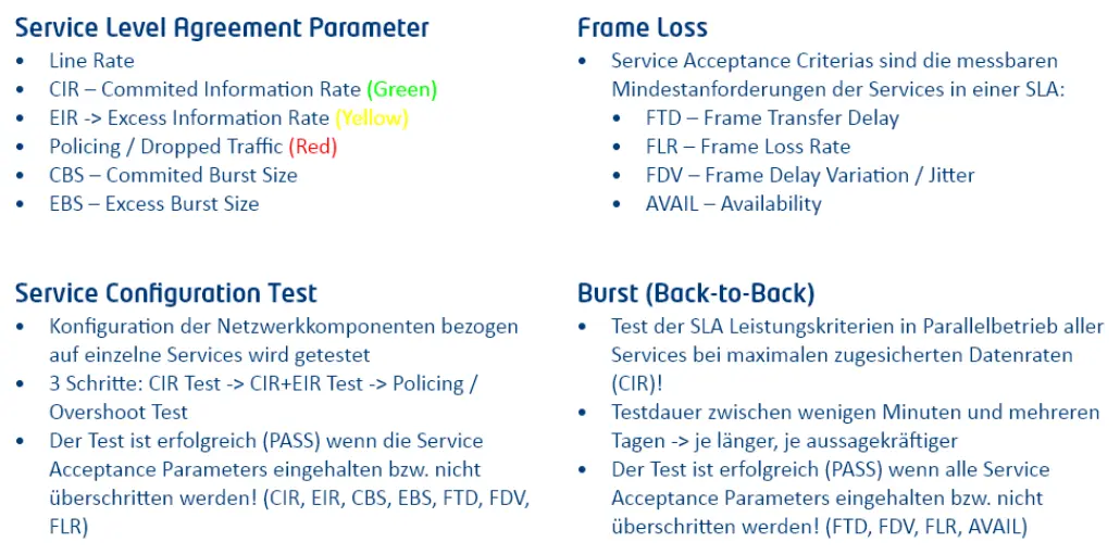 Da der RFC2544 einige Limitierungen für eine vollständige und effiziente End-to-End Netzwerkprüfung aufweist, wurde der Y.1564 Standard entwickelt. Dabei geht es in erster Linie darum, die in den SLA’s vertraglich vereinbarten Ethernet Services und Übertragunsraten zu testen. In einer 1. Phase wird ein Service Configuration Test durchgeführt, wobei die Line Rate, Excess Information Rate und Committed Information Rate ermittelt wird. Man spricht hier auch von Red-, Yellow- und Green-Traffic. In der 2. Phase wird ein Service Performance Test gestartet, dabei wird jeder auf derselben Verbindung zur Verfügung stehende Service parallel über eine bestimmte Zeit verifiziert. Die Service Acceptance Criterias sind Frame Transfer Delay, Frame Delay Variation, Frame Loss Ratio und Availability.